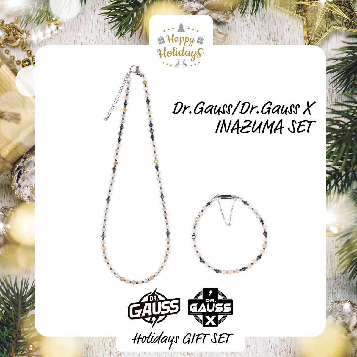 黄金の輝きを持つ天然石「ルチルクォーツ」をスタイリッシュに取り入れた磁気アクセサリー、「Dr.ガウス<INAZUMA/イナズマ>」と「Dr.ガウスX<INAZUMA/イナズマ>」の医療機器認証を受けたアクセサリーのクリスマス限定・数量限定ホリデーセットが登場です。