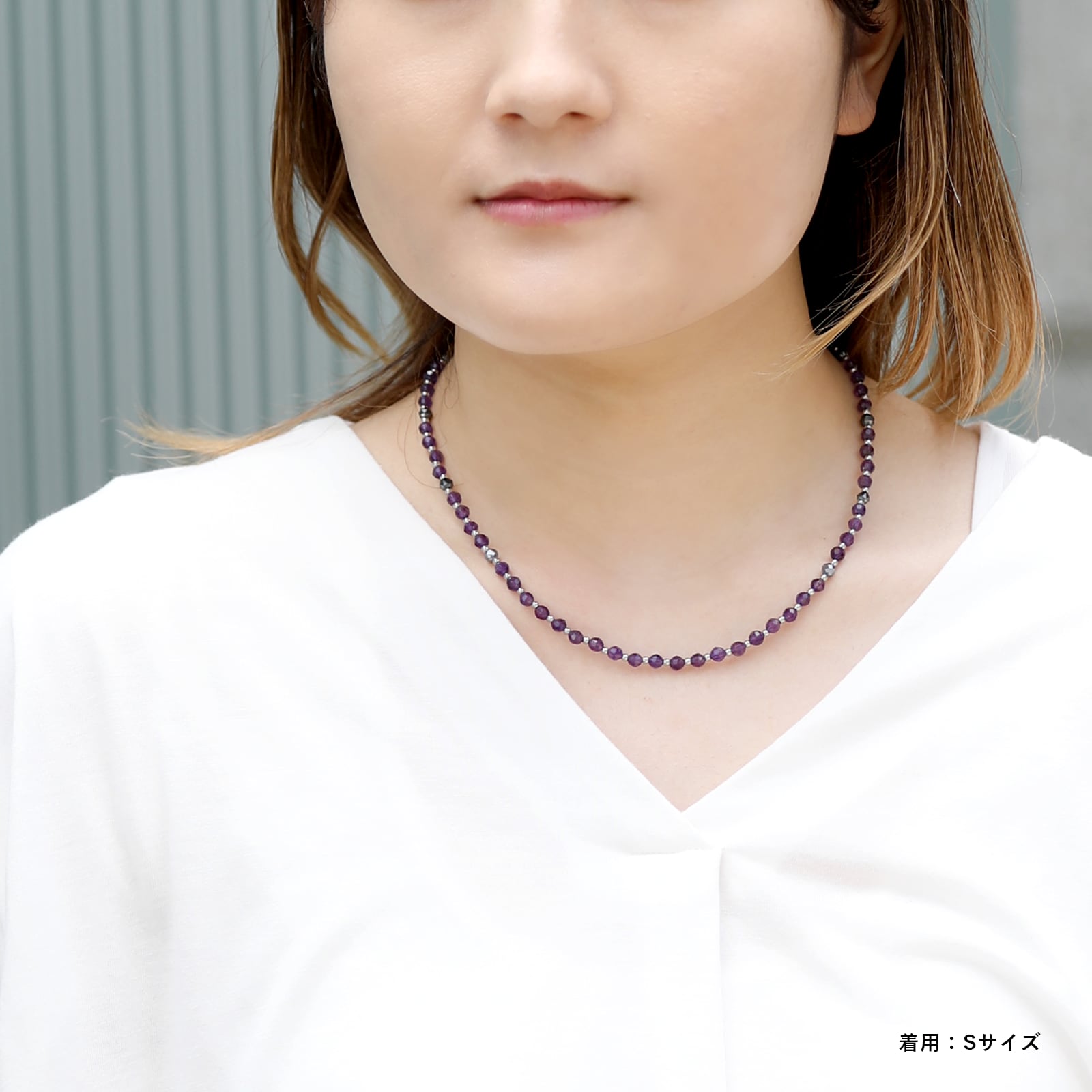 本製品に使用しているアメジストは天然石のため1つ1つのサイズに違いがございます。可能な限り近い大きさのもので製造しておりますが、サイズの違いで同一商品でも使用パーツ数に違いが生じてしまう製品です。予めご了承ください。