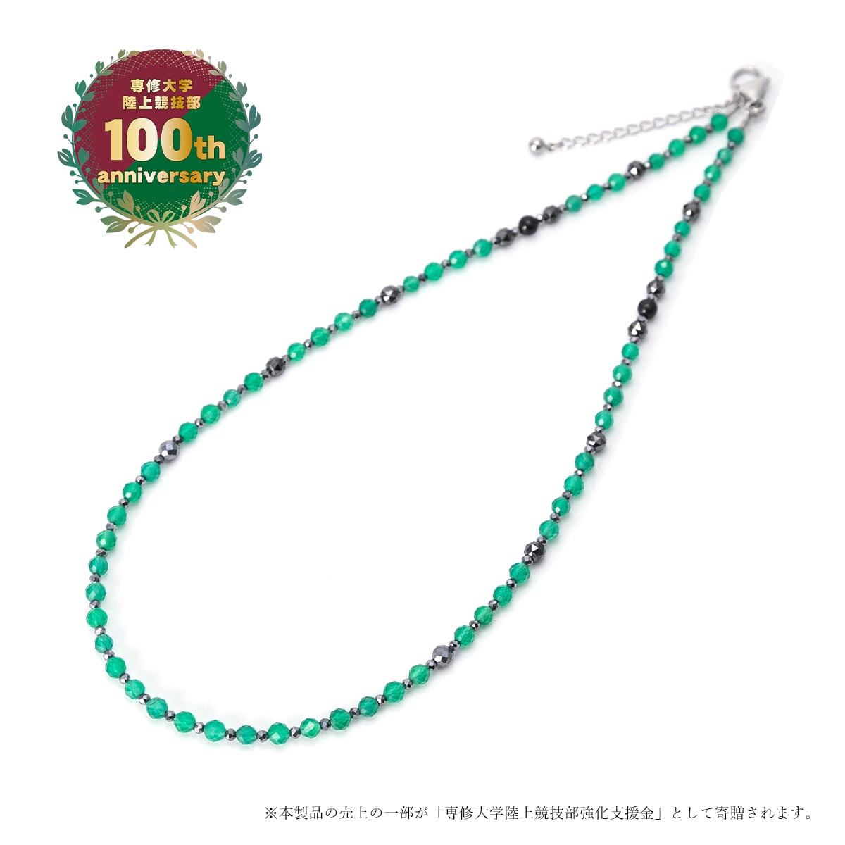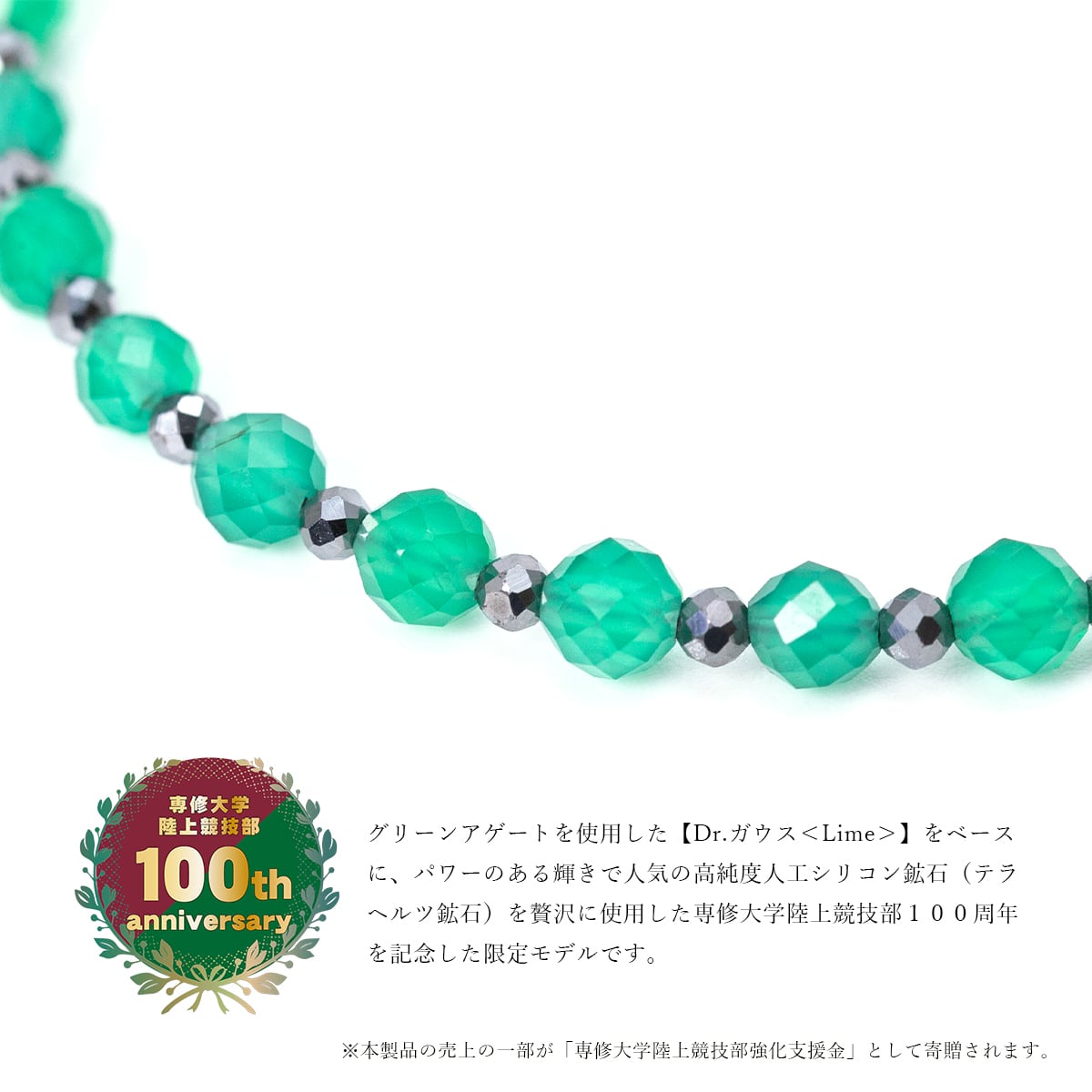 こちらの記念モデルは、専修大学陸上競技部創立100周年を記念し陸上競技部へ「グリーンアゲート」を使用したDr.ガウス<Lime>をベースに、通常で使用しているφ2.5ステンレスボールを全て、パワーのある輝きで人気の高純度人工シリコン鉱石(テラヘルツ)にを贅沢に変更しています。